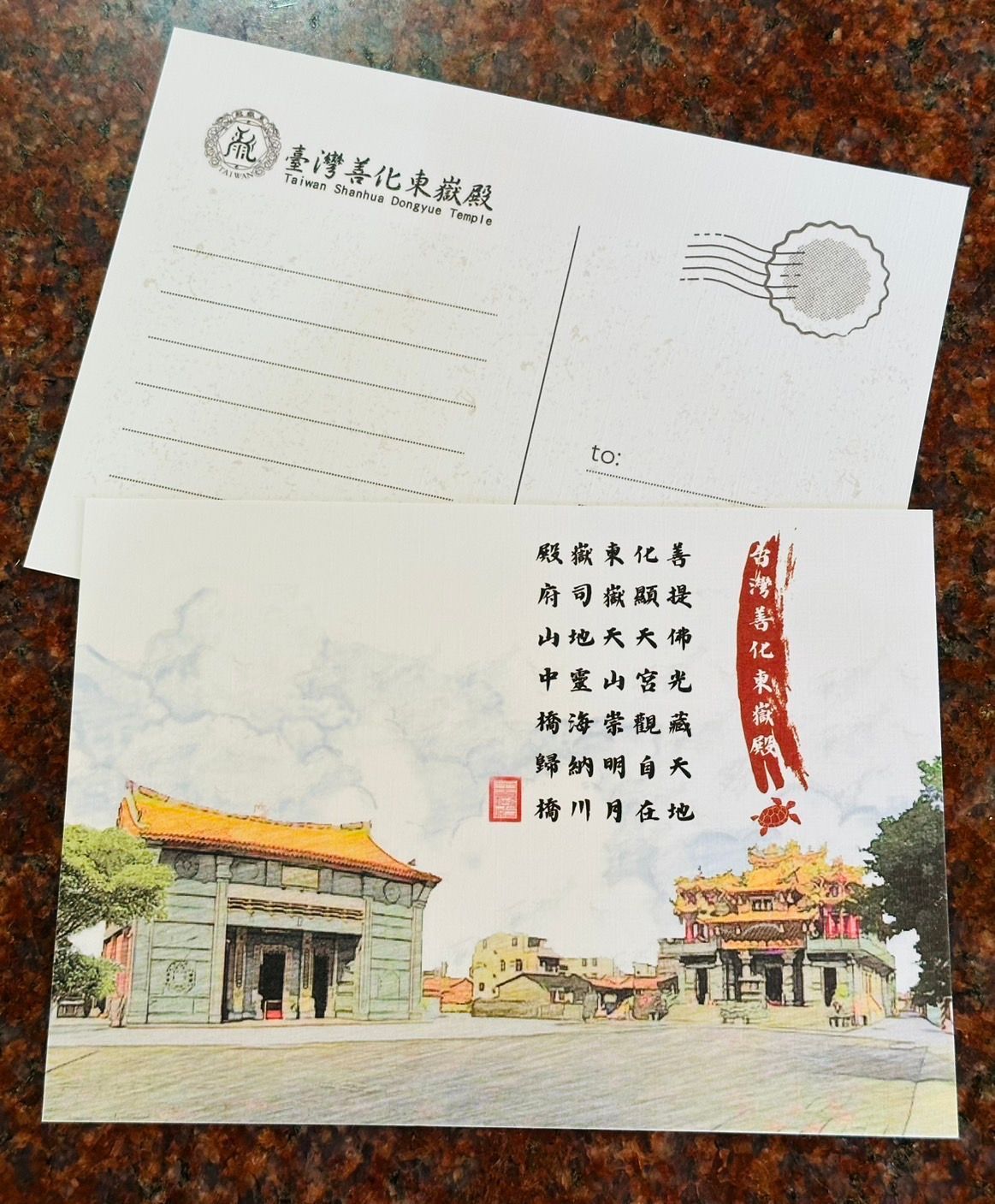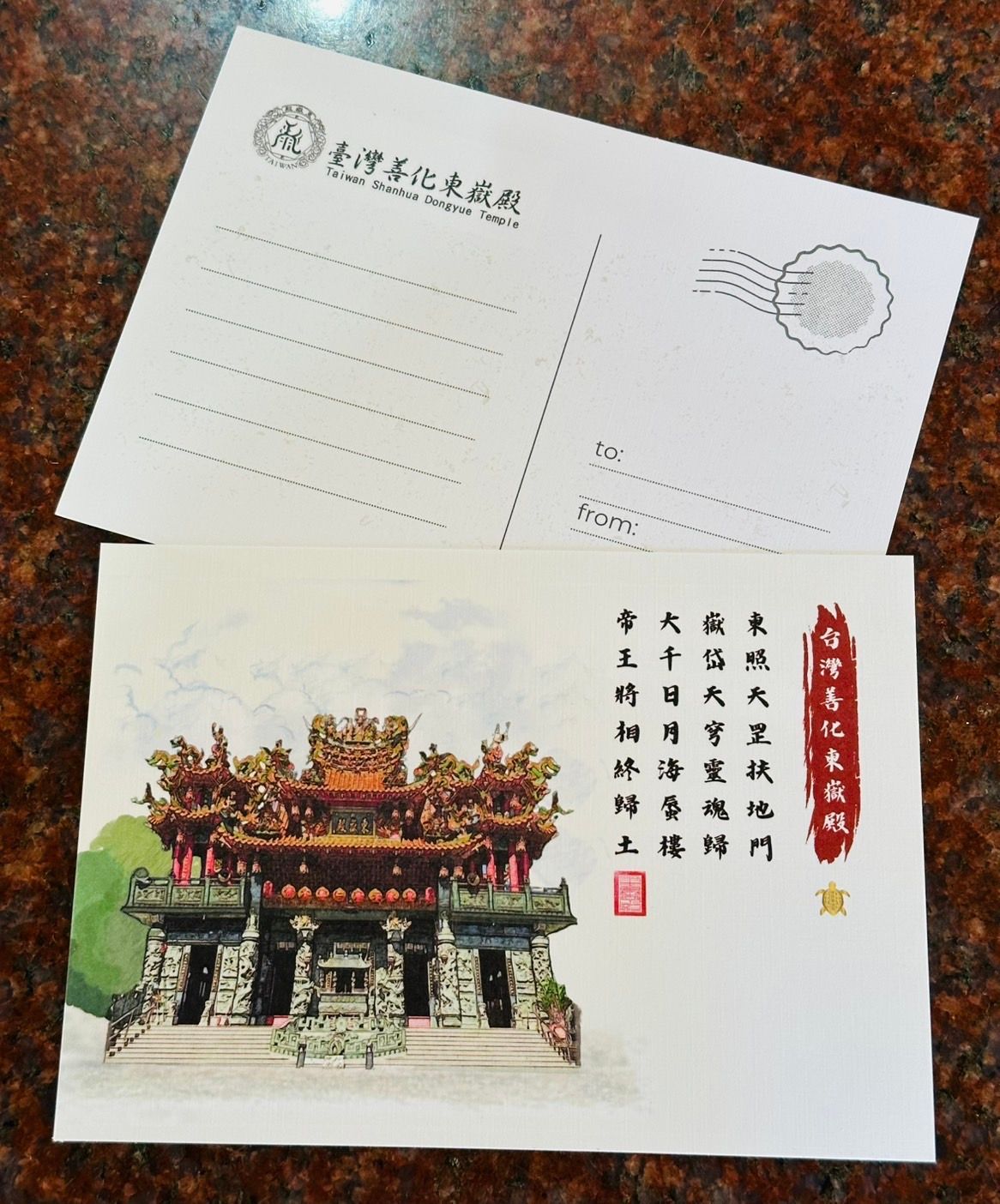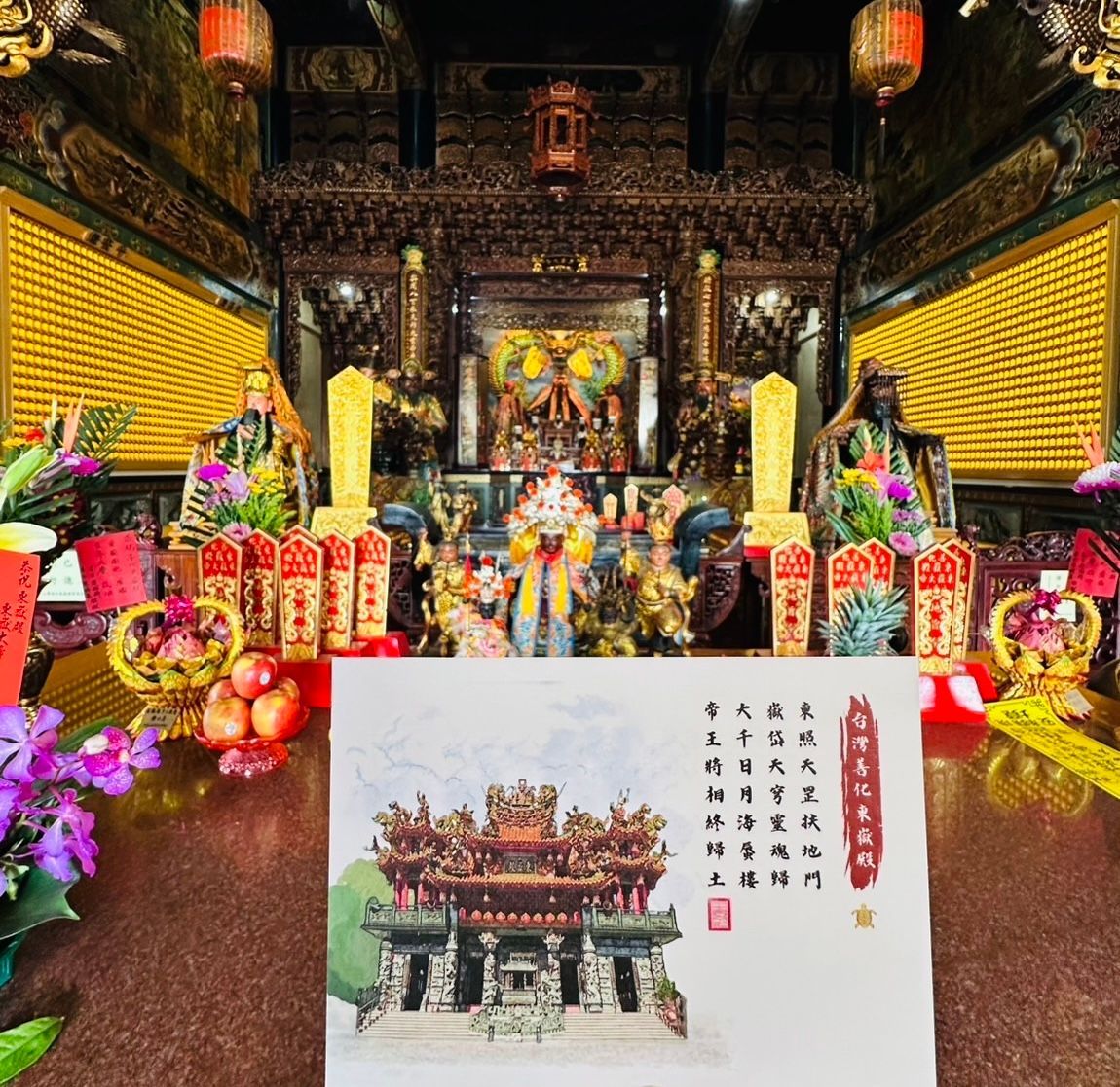 - 正面為手繪風格的宮殿圖像,展現善化東嶽殿古樸莊嚴之美